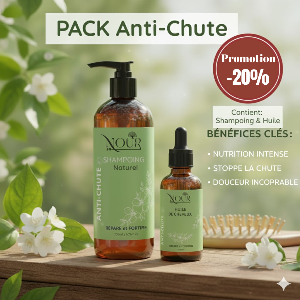 + شحن مجانيباقة نور لمكافحة تساقط الشعر هو الحل الطبيعي الفعّال لمشكل التساقط والضعف. الباقة كتتكوّن من شامبو طبيعي وزيت مغذّي للشعر، بتركيبة غنيّة بالمكوّنات الطبيعية لي كتقوّي الجذور، توقف التساقط، وترجع للشعر الحيوية ديالو.